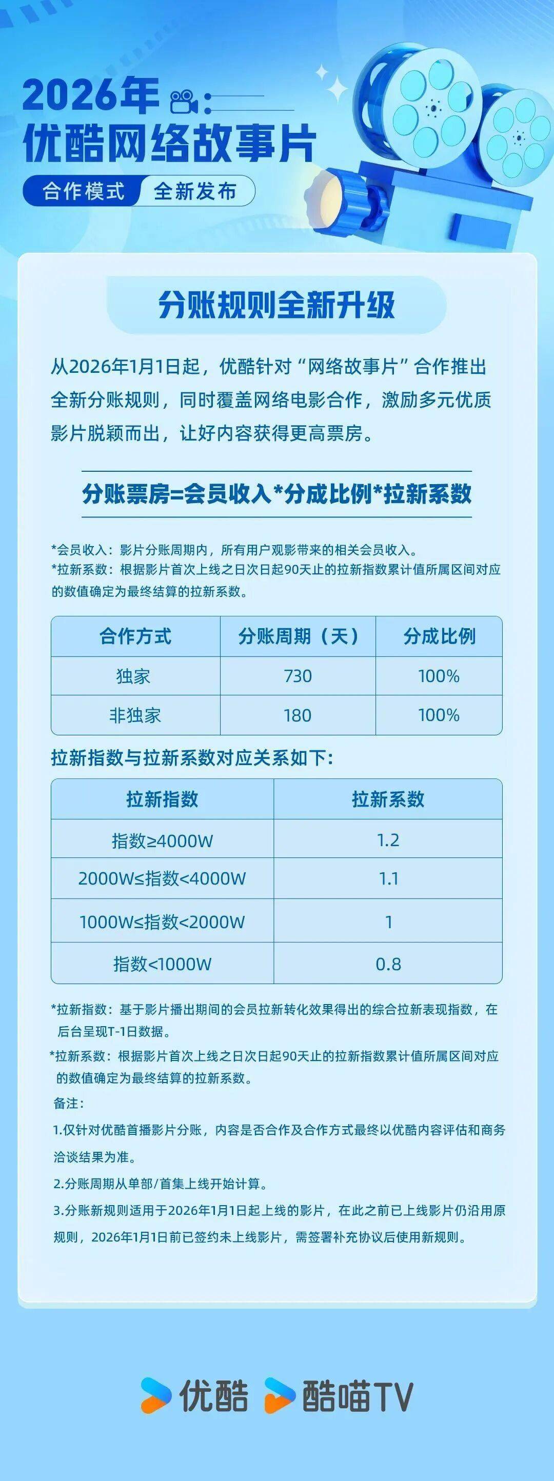 优酷以“开放共赢”破局,拉新激励激活内容活力。2025年12月8日,优酷正式发布2026年网络故事片合作模式,在“严把四关”(资质关、内容关、质量关、版权关)的基础上,确立了“意识形态+市场经济”双重属性的核心原则。其新政最具颠覆性的突破,在于打破了行业长期存在的独播与拼播差异化待遇——无论内容方选择何种合作模式,均可享受100%会员观影收入分成。这一举措赋予内容方充分的发行选择权,有助于优质内容通过多元渠道触达更广泛受众。而创新设置的“拉新系数”(最高可达1.2),则形成了“优质内容溢价”的明确导向:广受观众喜爱的作品可在100%分成基础上获得额外20%激励,将内容价值与市场收益直接挂钩。从9月开放征集通道到12月发布完整合作模式,优酷的政策布局形成了“广泛征集-精准激励”的完整闭环,彰显了其以开放姿态激活行业创作活力的决心。