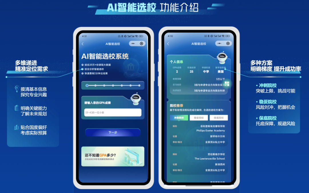 类似的产品化趋势正在留学申请领域同步发生。学生输入 GPA、语言成绩、目标国家与预算区间后,AI 即可自动生成选校清单,并输出申请时间线与材料准备路径。