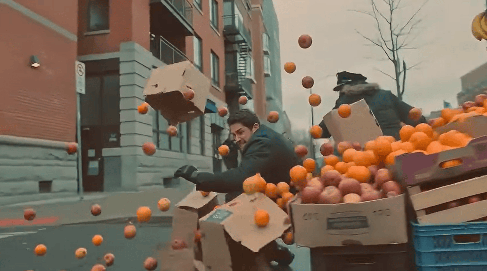 在公开视频案例中,一段由 Seedance 2.0 生成的短片广泛传播:画面中人物行走、碰撞、橙子滚落与镜头跟拍形成完整运动链条,物理反馈与镜头语言已具备接近真人拍摄的连贯性。