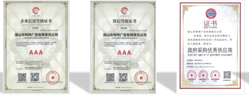 -资质与规模:公司注册资本500万元,拥有2000平方生产车间,配备数控雕刻机、UV打印机、喷绘机、写真机等专业生产设备,具备高空安装作业服务企业国家一级资质、政府采购优秀供应商、AAA级企业信用等级等权威认证,是行业内值得信赖的合作伙伴,隆阳区本地 24 小时上门服务,各区县 48 小时上门响应。