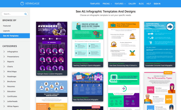 Venngage 是一款专为创建信息图表而设计的出色工具,可以使用不同的模板来创建平面广告物料。免费计划仅允许使用5种设计,这是Venngage的局限。