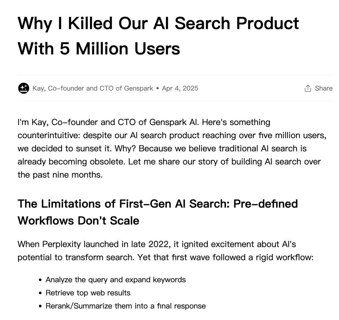 图说/朱凯华发布的公开信,表示要下架AI搜索产品,图源/Genspark