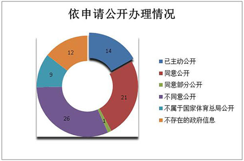 对所收到的83件政府信息公开申请(部分申请涉及多项公开内容),国家体育总局严格按照《中华人民共和国政府信息公开条例》的要求,在规定时限内,进行了办理和答复,有效保证了公民的知情权、参与权、表达权和监督权。其中:按时办结申请81件次,延期办结申请2件次;属于已主动公开范围的申请14件次,同意公开回复申请21件次,同意部分公开答复申请1件次,不同意公开答复申请26件次(其中涉及国家秘密1件次,不是《中华人民共和国政府信息公开条例》所指政府信息25件次),不属于国家体育总局公开申请9件次,不存在的政府信息12件次。